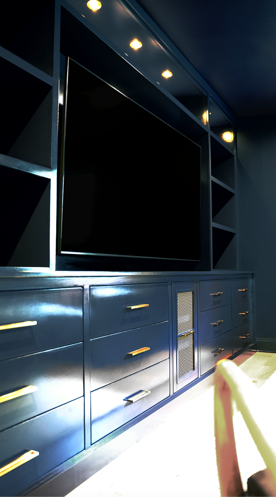 Custom built-in entertainment unit with high gloss automotive paint, brass hardware and integrated lighting and power sources.